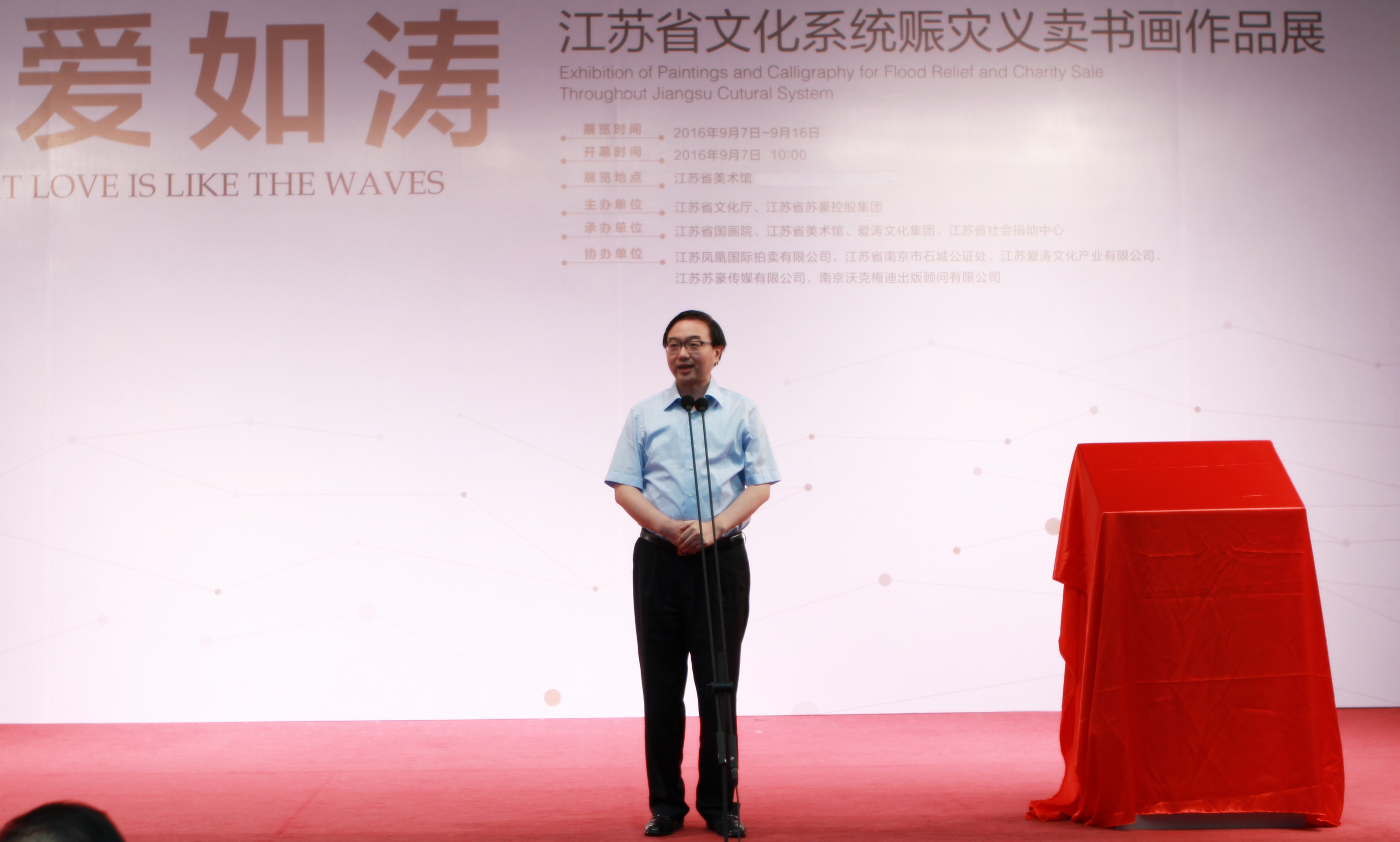由江蘇省文化廳、江蘇省蘇豪控股集團共同主辦,江蘇省國畫院、江蘇省美術館、愛濤文化集團、江蘇省社會捐助中心共同承辦的“大愛如濤——江蘇省文化系統賑災義賣書畫作品展”,于9月7日在江蘇省美術館正式開幕,為期10天。并同步出版發行由蘇豪控股集團董事長王正喜主編的《大愛如濤——江蘇省文化系統賑災義賣書畫作品集》。