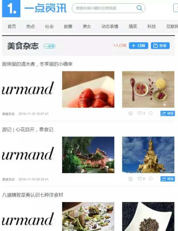 《美食》雜志微信公眾號自開通以來,一直傳遞餐飲熱門信息,分享優質美食文章,兼顧專業與娛樂。因《美食》雜志微信公眾號注重內容質量,閱讀量可觀,“一點資訊”和“今日頭條”信息分發平臺向《美食》雜志微信公眾號發來入駐邀請函。