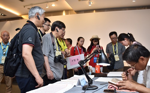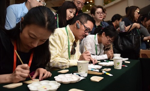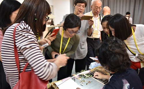 在非遺表演項目南京方山大鼓的歡騰聲中,港澳交流訪團開啟了愛濤藝術中心的非遺文化之旅。吳楚風韻江蘇省非物質文化遺產精品展向訪團展示了精巧雅致的核雕,工藝獨特的常州梳篦,秀麗、清雅的蘇繡,巧奪天工的南京金箔鍛制品,溫潤如玉的留青竹刻等國家級、省級的非物質文化遺產項目,并參與體驗了梳篦的制作和上色。這些杰出的非遺作品令港澳交流訪團連連稱道,贊不絕口。