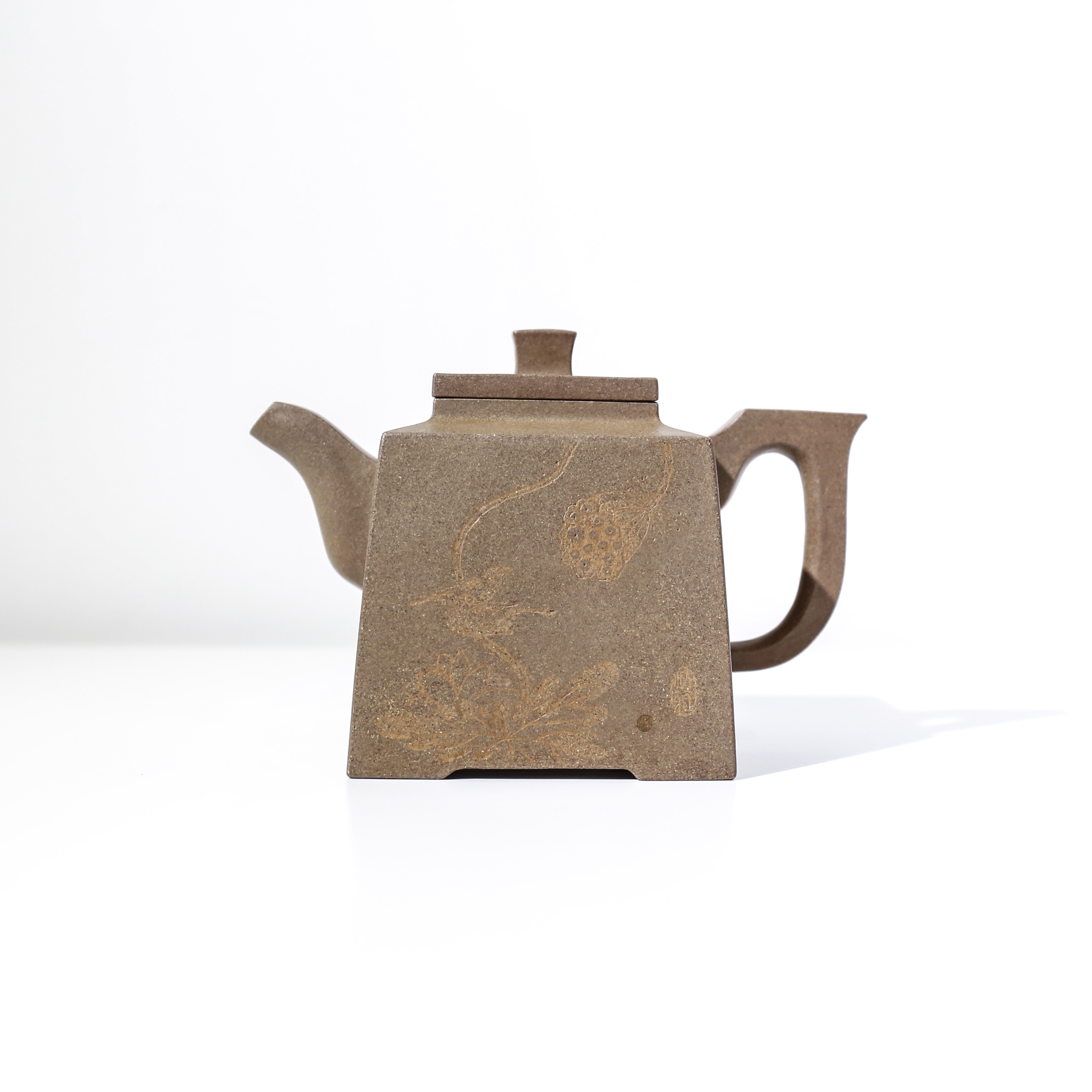 此作品選用了明清磚色泥料,并融入明清時期的線條感,線條中既有弧度,又不失穩重、大氣。壺身一面配有詠荷雅句,另一面刻有一枝若隱若
