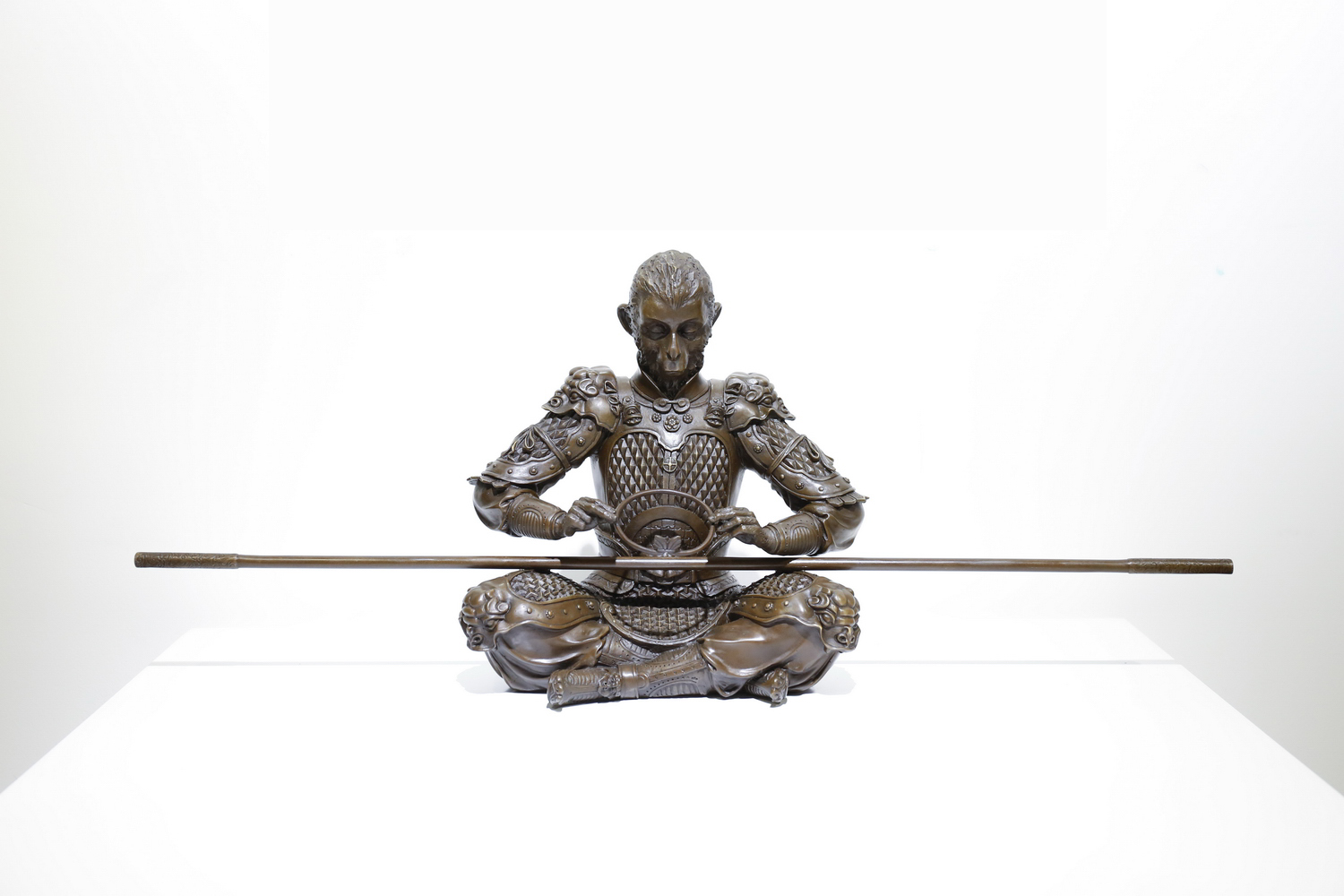 斗戰勝佛重在渲染禪悟思想。創作靈感來源于張墨一老師原畫和影片大話西游里的經典片段,并進行了藝術融合和工藝提煉。制作上把大圣定格在了手持金箍圈欲戴又欲止的心理矛盾中。作品造型舍動求靜,然“靜”中更傳遞著取舍間的大悟。