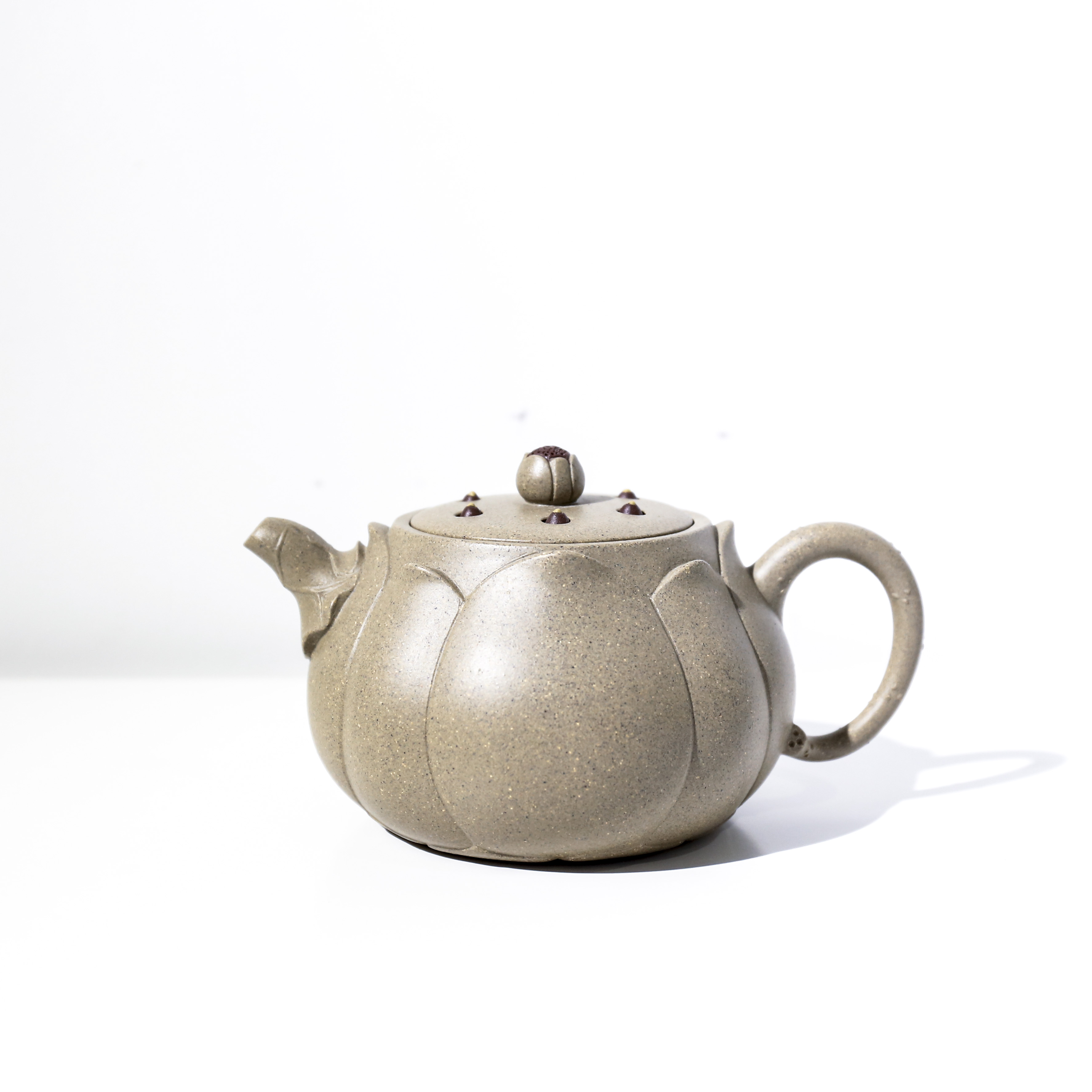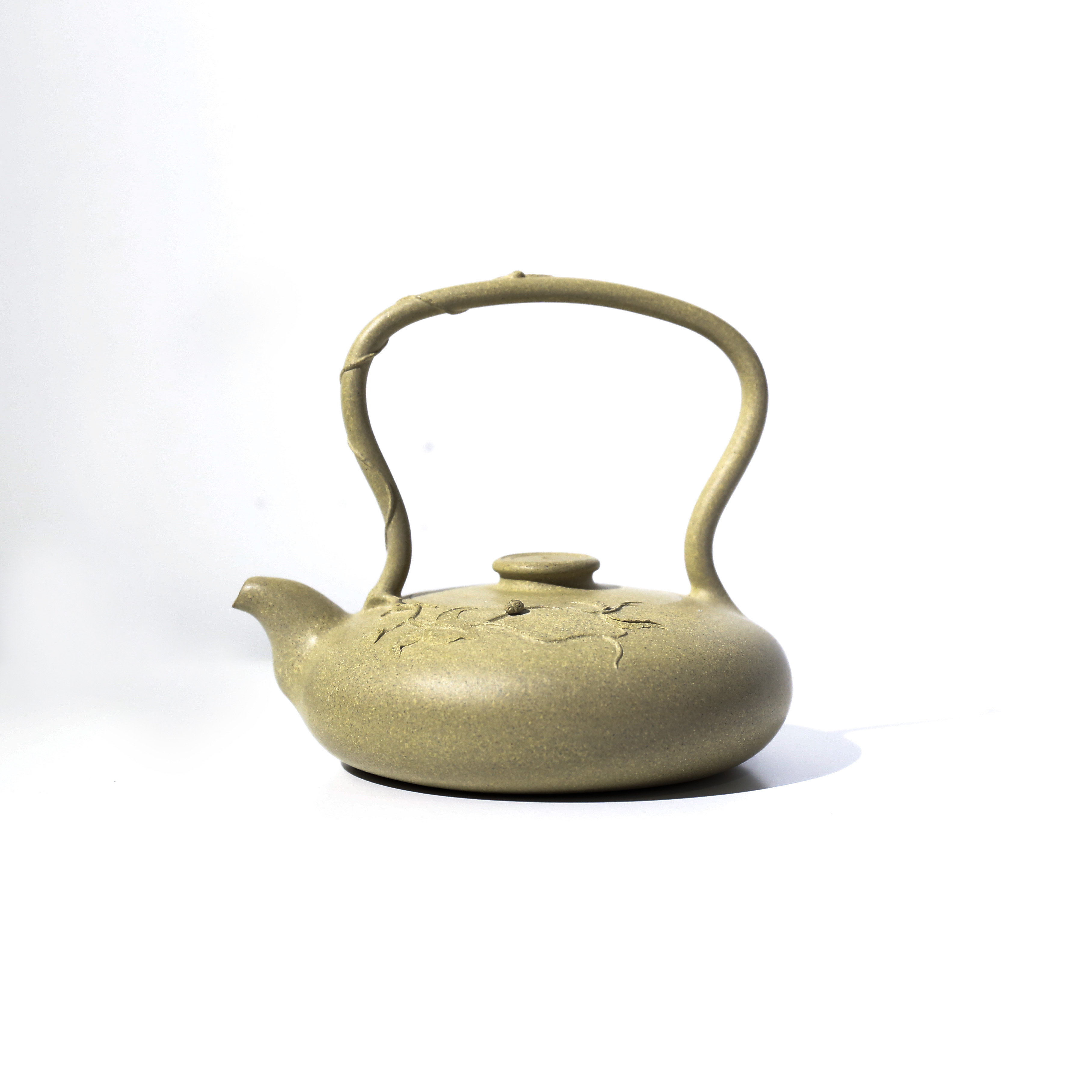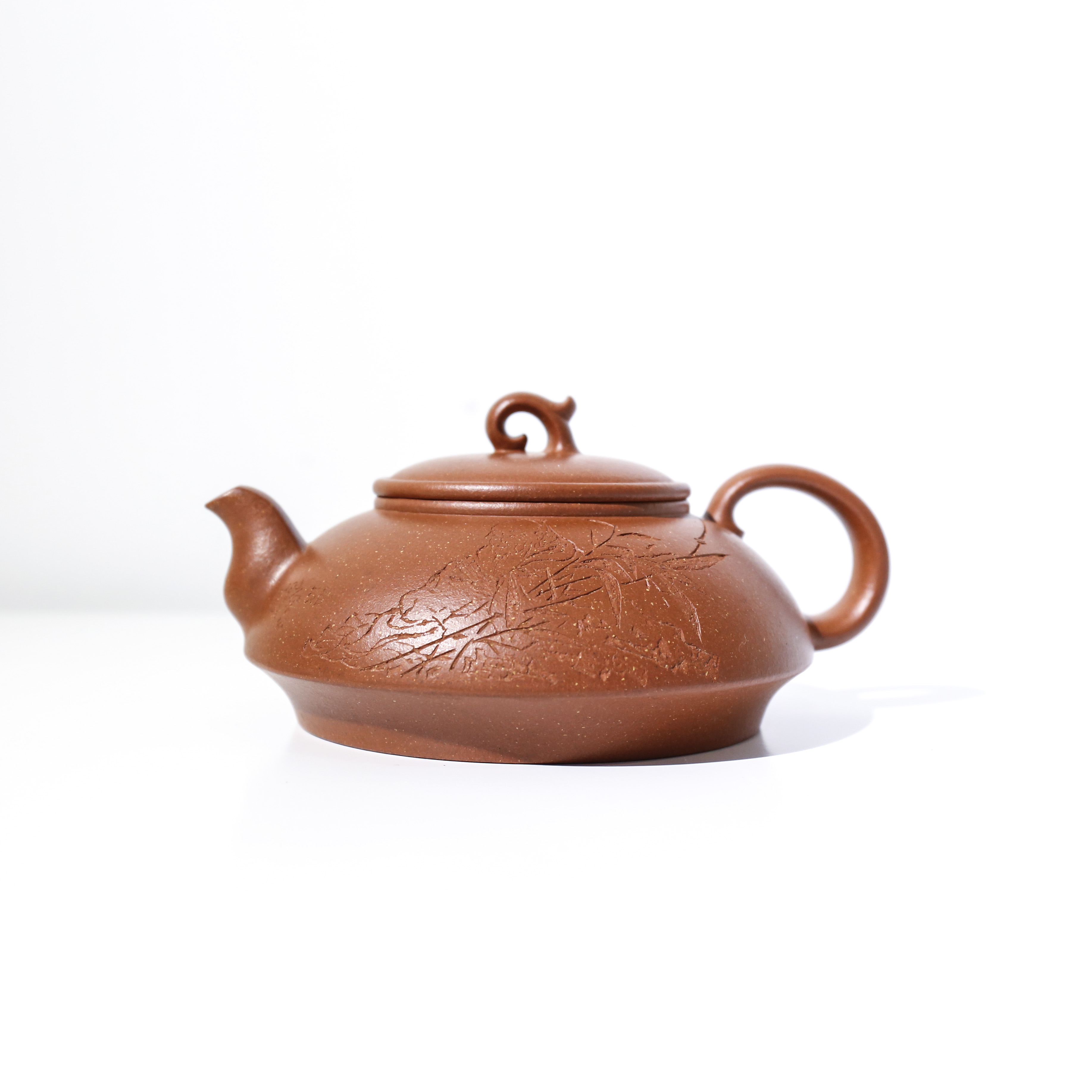 《新姿》一壺設計于丁酉早春,設計的靈感來源于一盆案頭水仙。“幽姿冉冉弄晴煙,玉蕤暈碧曉肌鮮。”作品精選黃龍山原礦紅降坡泥料,泥料色澤紅潤,油脂極好。制作時充分考慮三維一體的空間理念,作品的每一個視角都力求把握線條的美感與整體的協調性。壺身部分的線條則緩沖流暢,于明暗轉折、虛實對比中凸顯出此壺的溫潤、凝重、古雅之風。