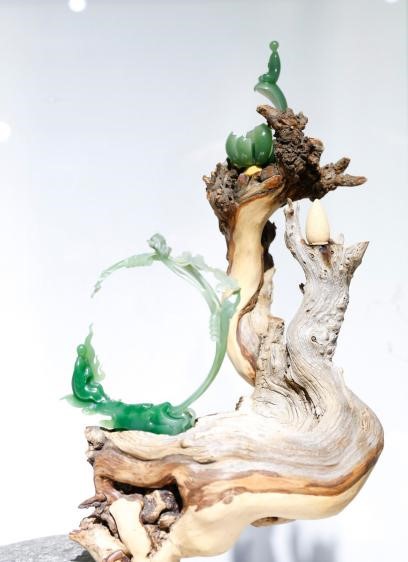 該作品創作靈感源于邊角料的極致運用,整套作品的設計更跳脫以往一貫的思路,將玉器的設計視野擴大到整體的擺設背景,將全面的視覺張力延伸,更強地展現作者想表現的意境。