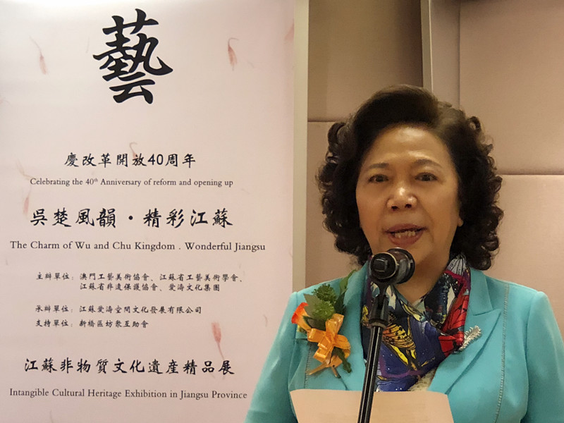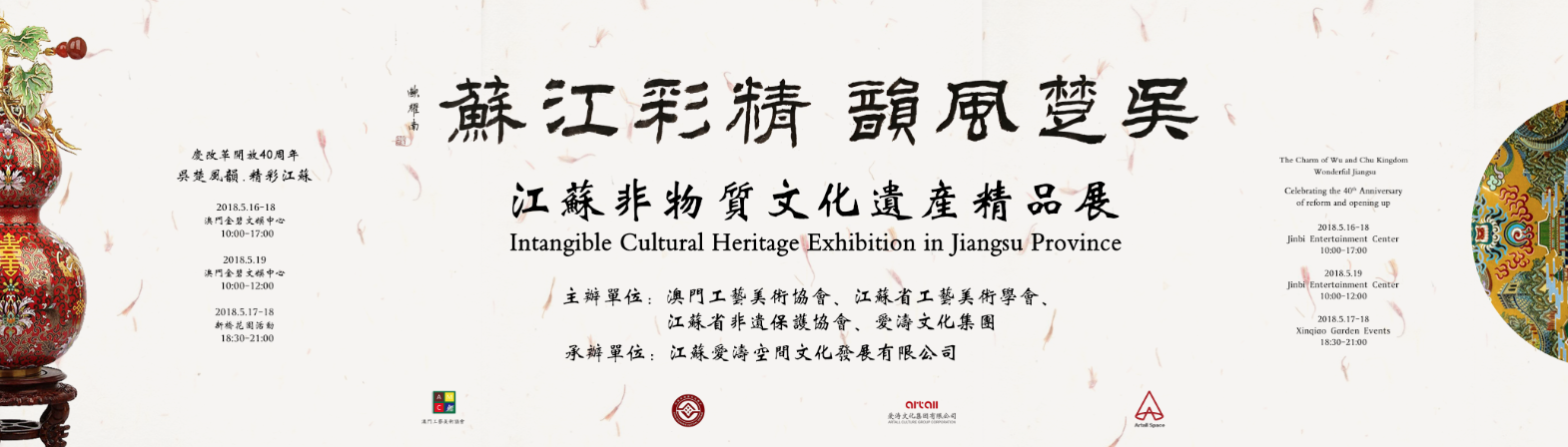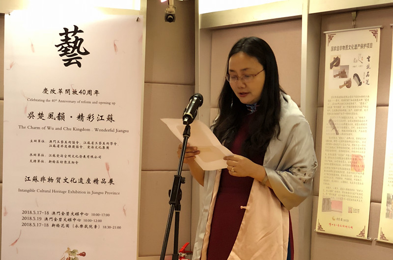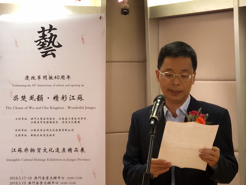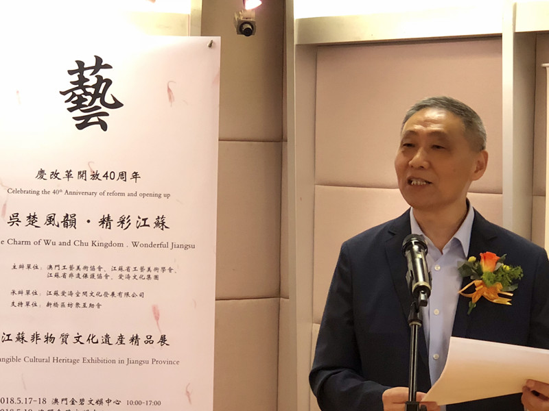 由澳門工藝美術協會、江蘇省工藝美術學會、江蘇省非遺保護協會、愛濤文化集團聯合主辦,江蘇愛濤空間文化發展有限公司承辦,澳門新橋區坊眾互助會協辦的文化部2018年內地與港澳文化交流重點項目“慶改革開放40周年吳楚風韻.精彩江蘇澳門行--江蘇省非物質文化遺產精品展”,5月16日至19日在澳門舉行。